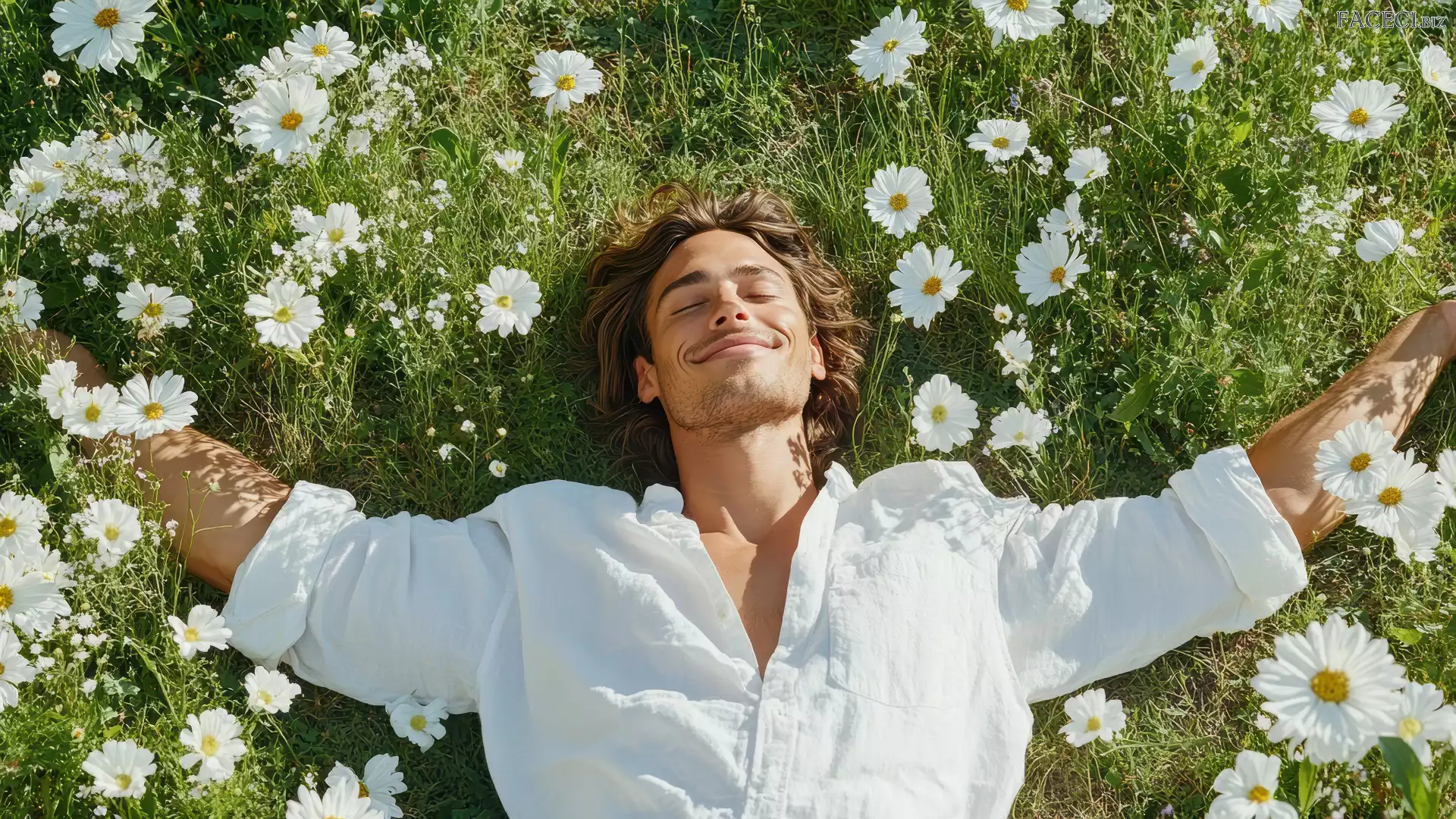 Mężczyzna, Kwiaty, Łąka, Stokrotki - faceci.biz
